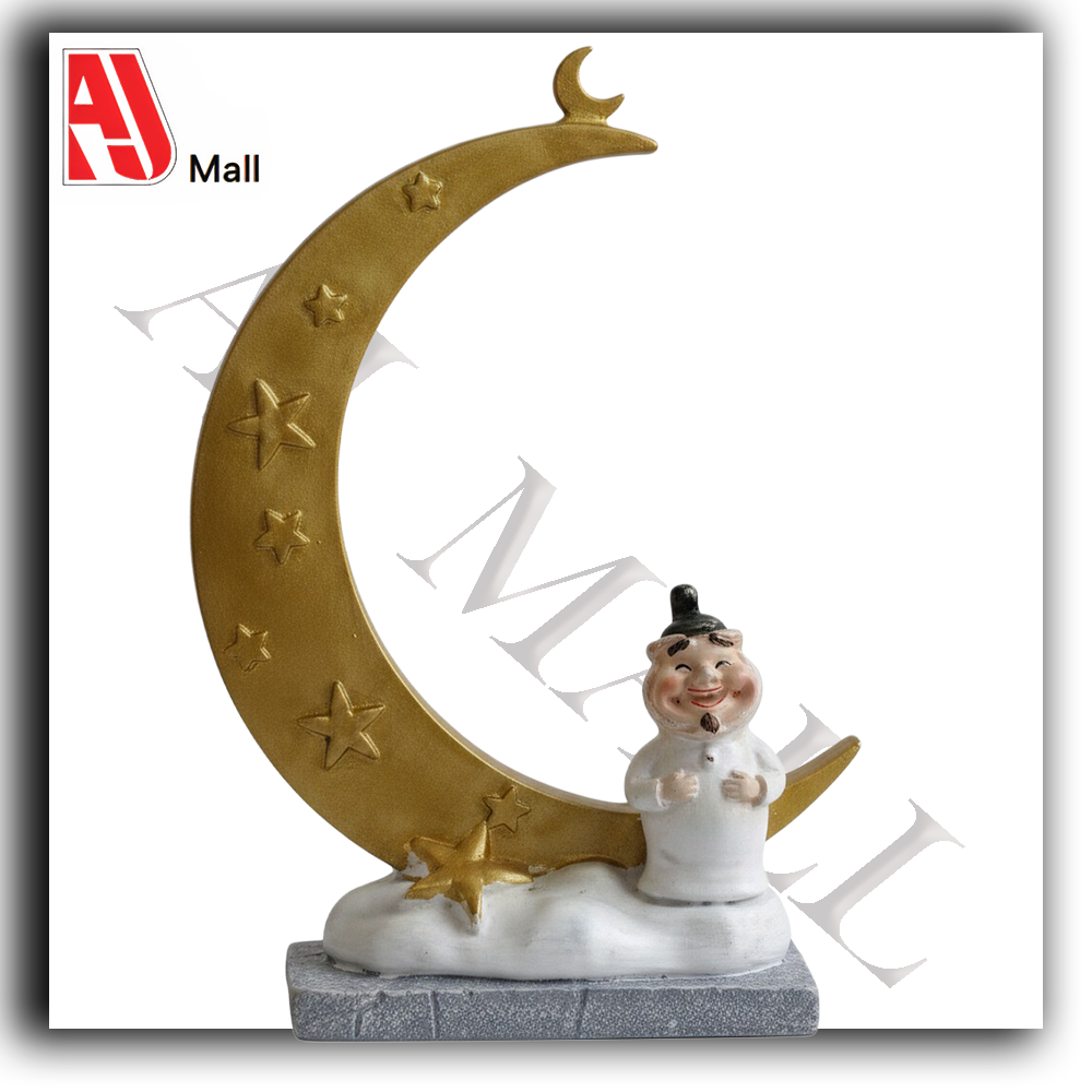 Beautiful Islamic decorative ornament featuring a large golden crescent moon adorned with star details and a charming traditional figurine standing beside it. The elegant design symbolizes Ramadan and Islamic celebrations, making it a perfect decorative piece for homes, prayer rooms, and festive setups.
